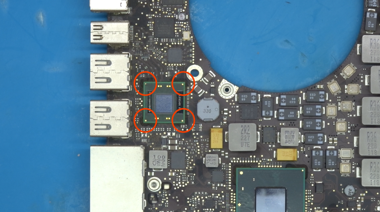 After the epoxy has been removed, LIGHTLY scratch the solder mask on the right side, upper side, left side, and finally lower side of the Thunderbolt 1 chip(represented as red rectangle).