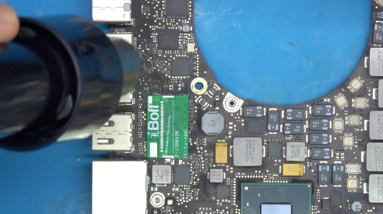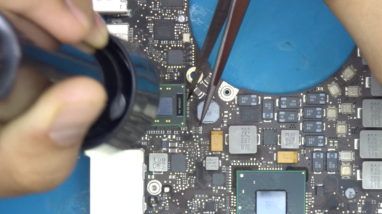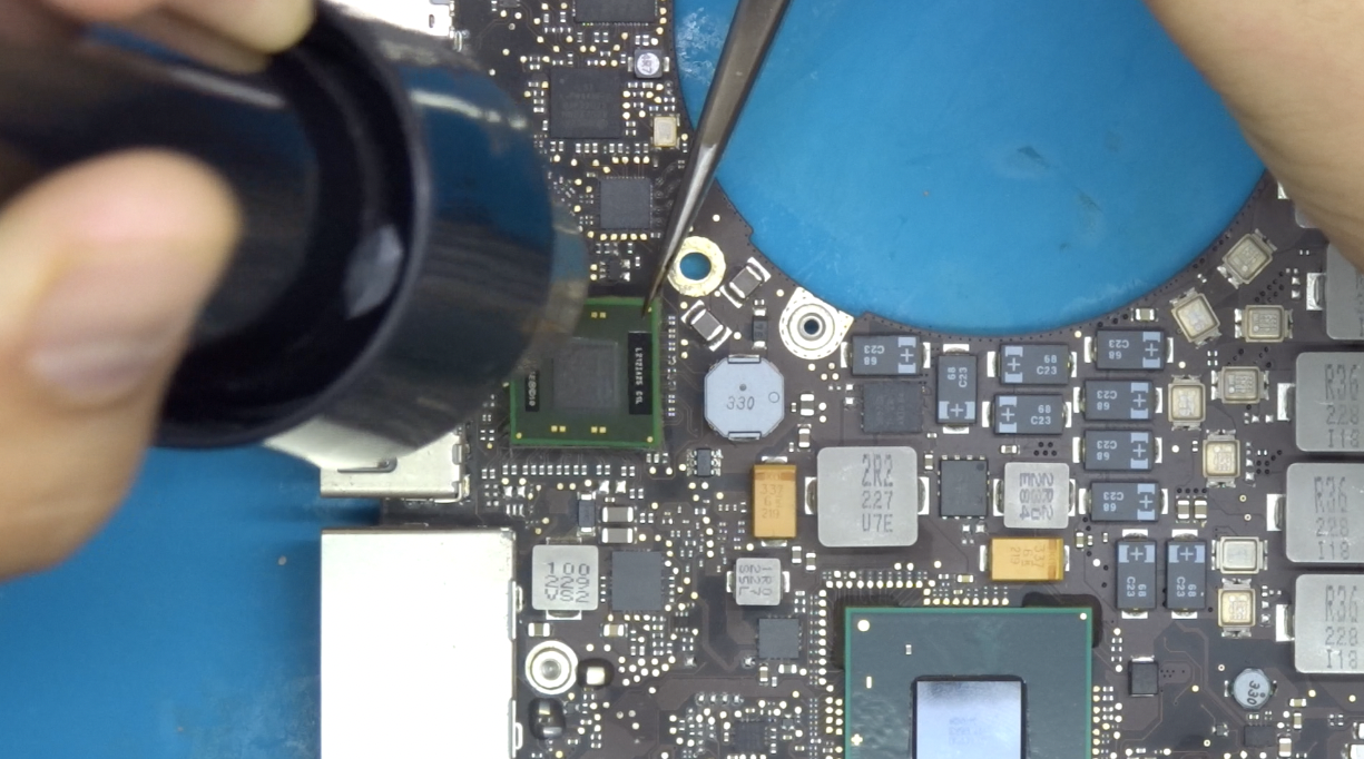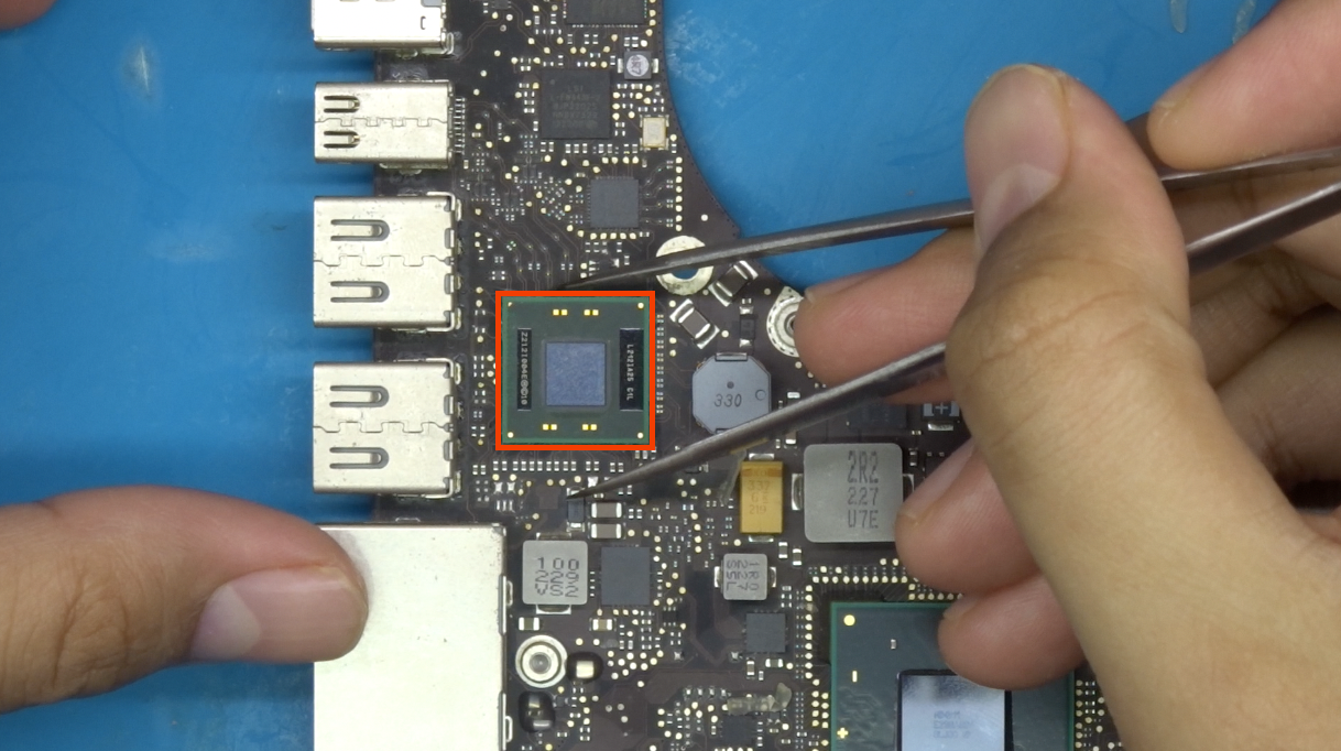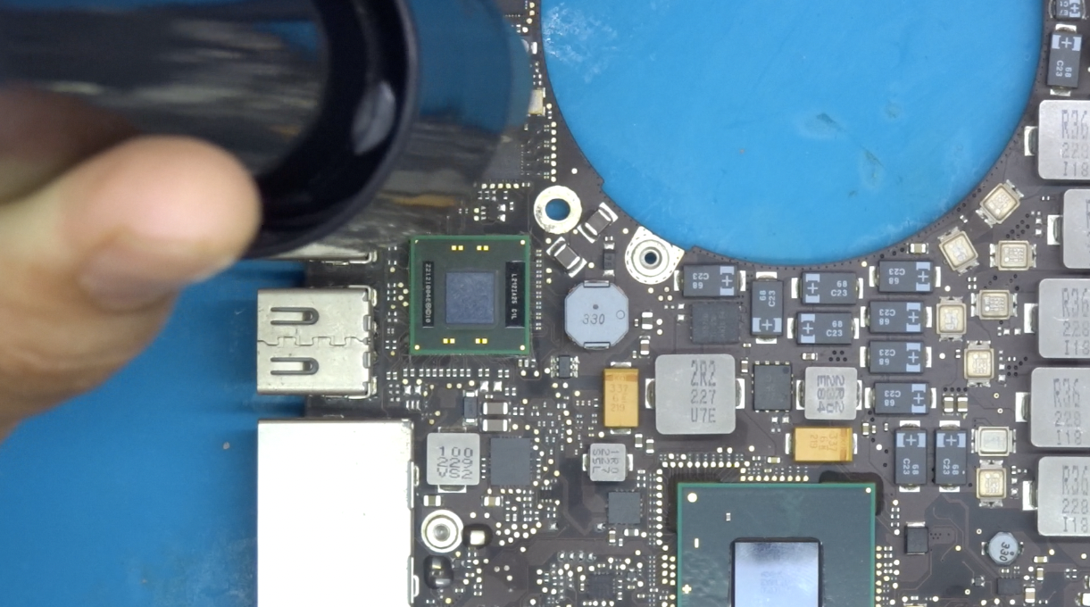 As you preheat the local area for around 1 minute, the board should already retain enough heat, so bring the hot air tip closer to the board, targeting the TBT chip. One of the ways to know if it is safe to take off the chip, is to poke the AC coupling capacitors at the side of the TBT chip.
