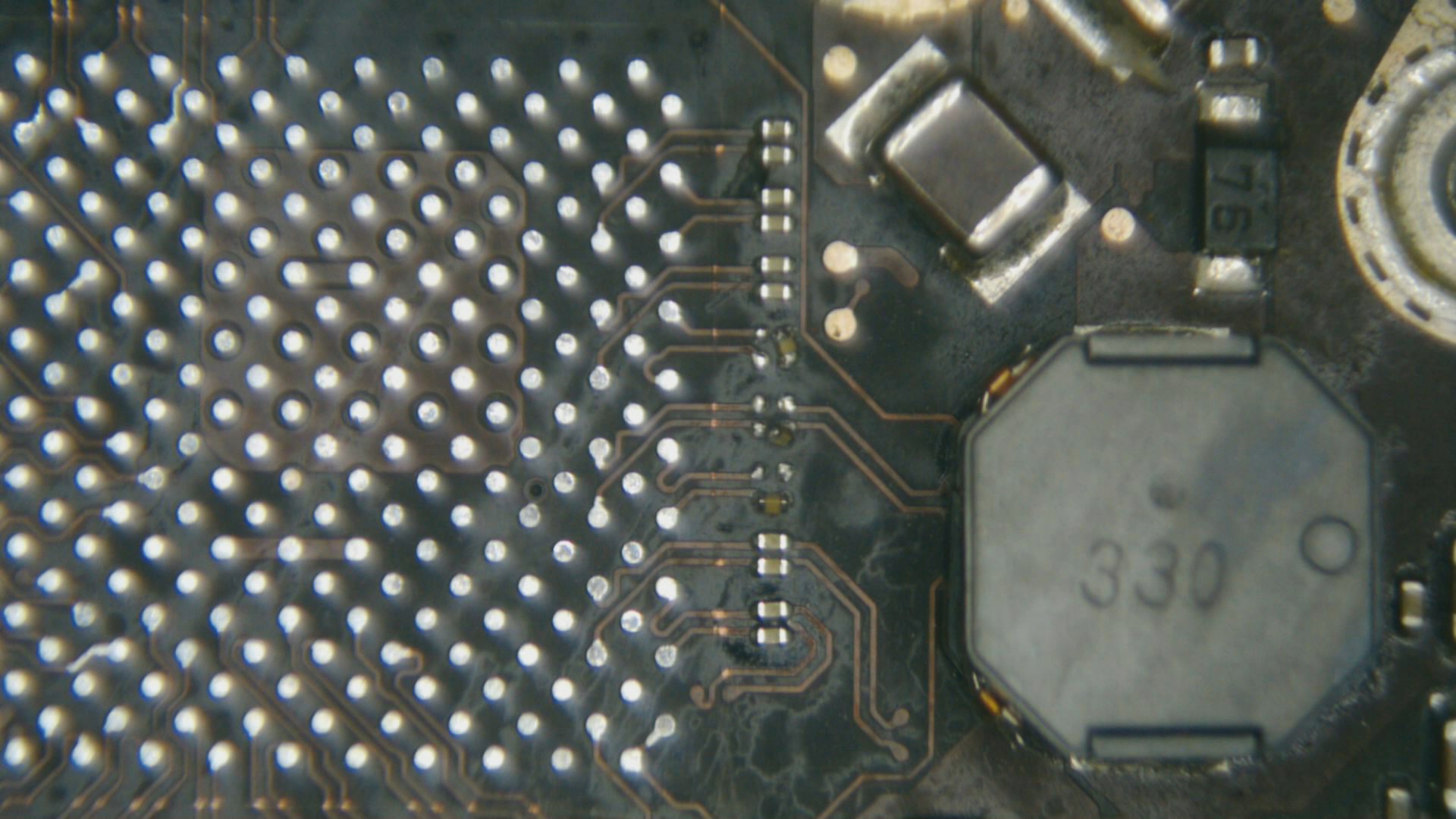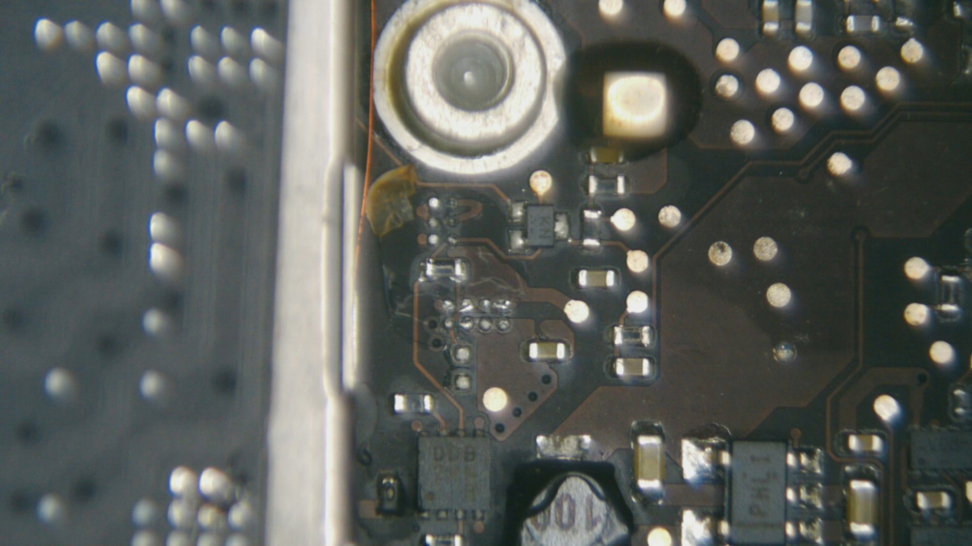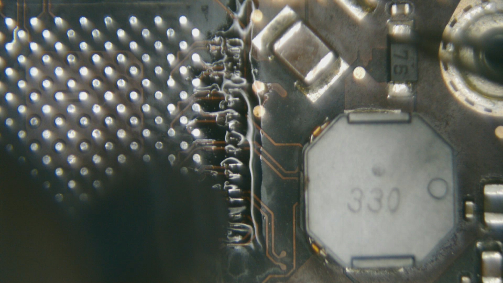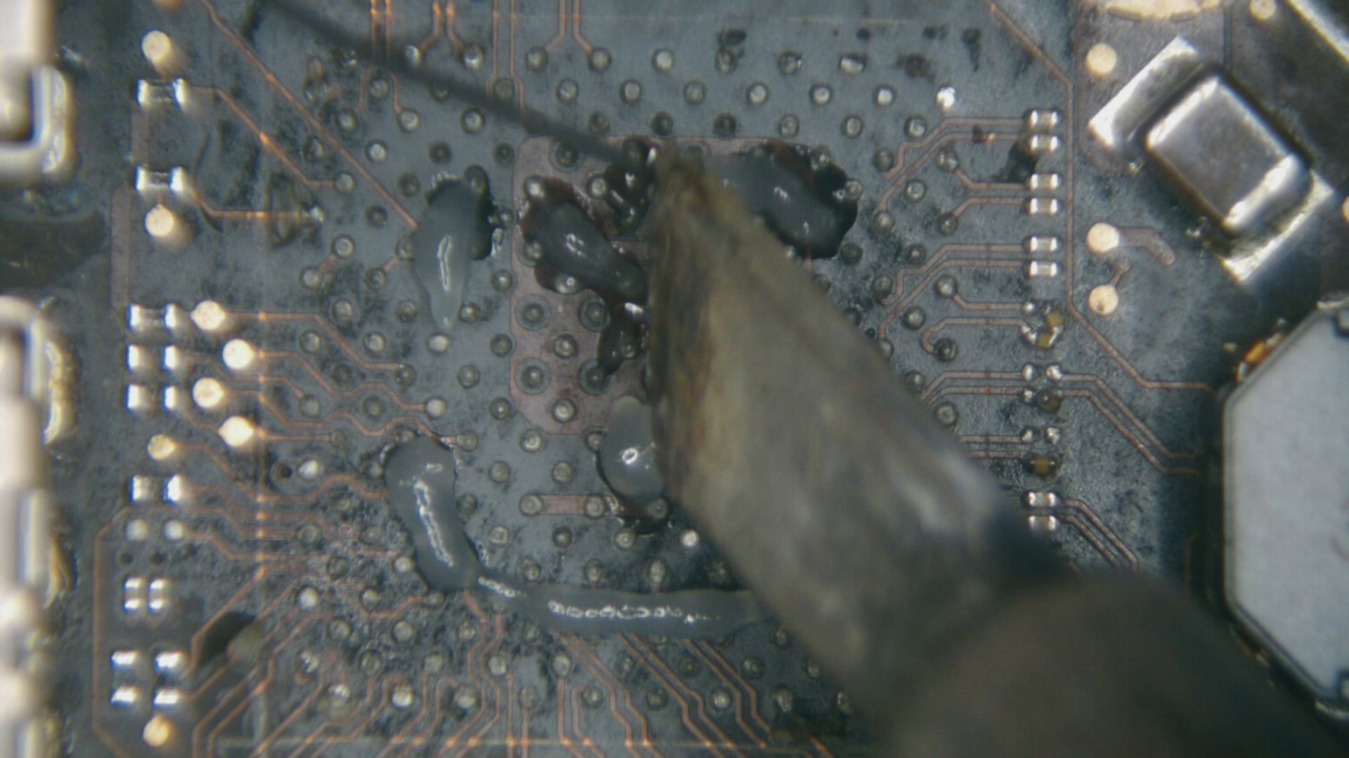 Usually we’ll use the highest temperature and air settings on the Quick hot air (857DW+), with the nozzle on, and the heat reaching the MLB is controlled by adjusting distance from the board. By blowing the hot air to the epoxy by maintaining 2-inch distance from the target, the surrounding epoxy should become soft so you can carefully remove them using a pair of tweezers.