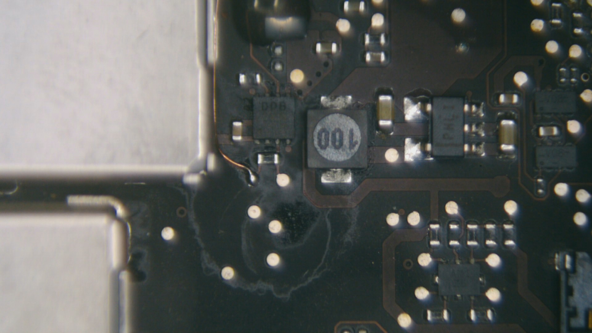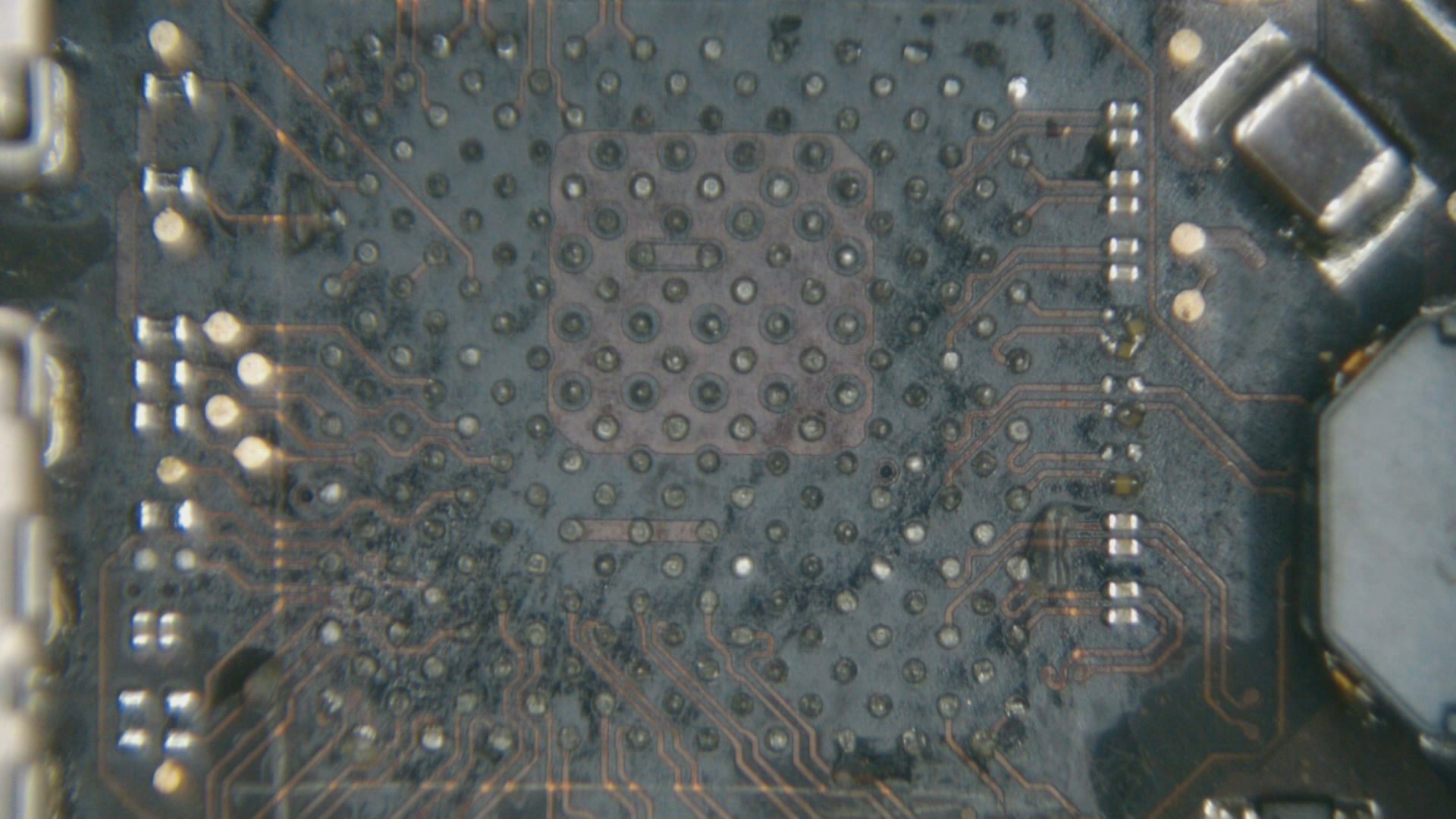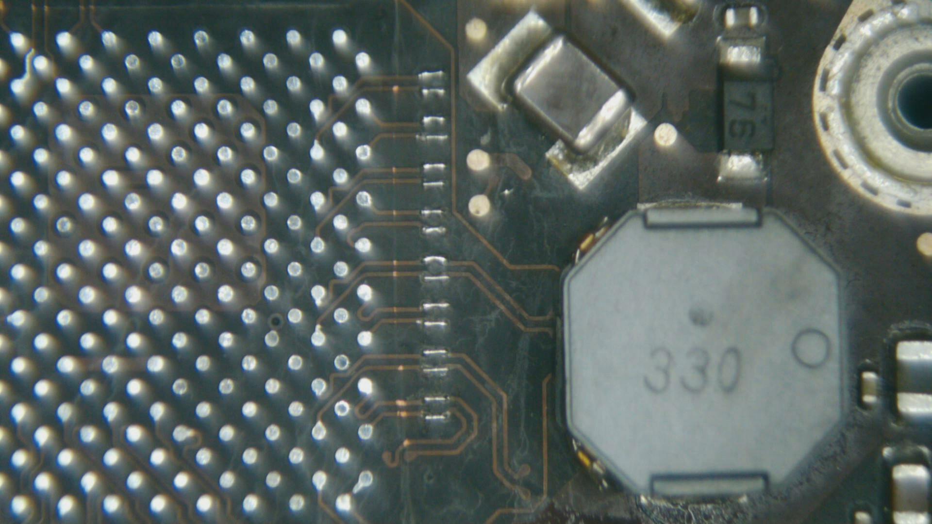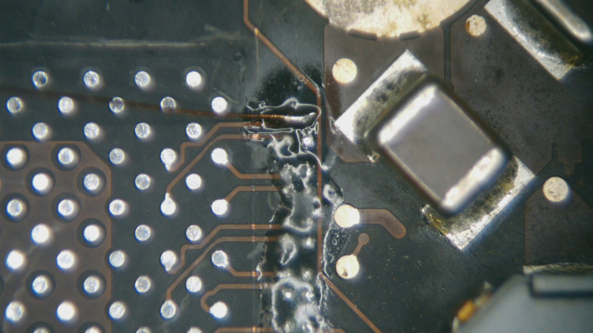 Usually we’ll use the highest temperature and air settings on the Quick hot air (857DW+), with the nozzle on, and the heat reaching the MLB is controlled by adjusting distance from the board. By blowing the hot air to the epoxy by maintaining 2-inch distance from the target, the surrounding epoxy should become soft so you can carefully remove them using a pair of tweezers.