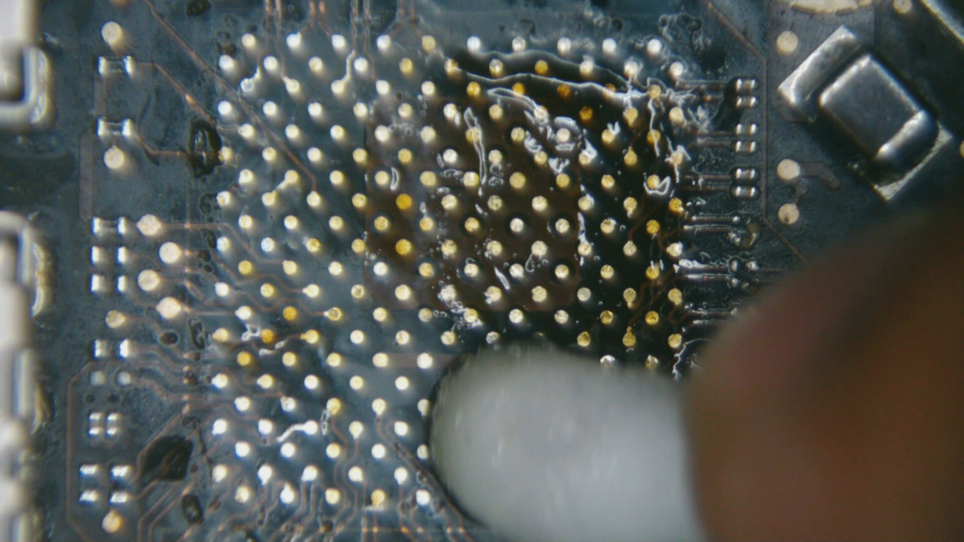 Take off your hot air nozzle again and perform the same preheating steps to the local area of the MLB. After 40 seconds or so, you can target the heat directly to the center of the NevBolt-2, but this time it won’t take too much heat to reach liquidus(185C) because the NevBolt-2 balls are actually leaded solder balls.