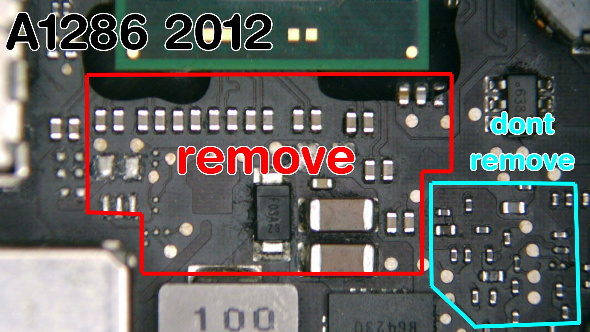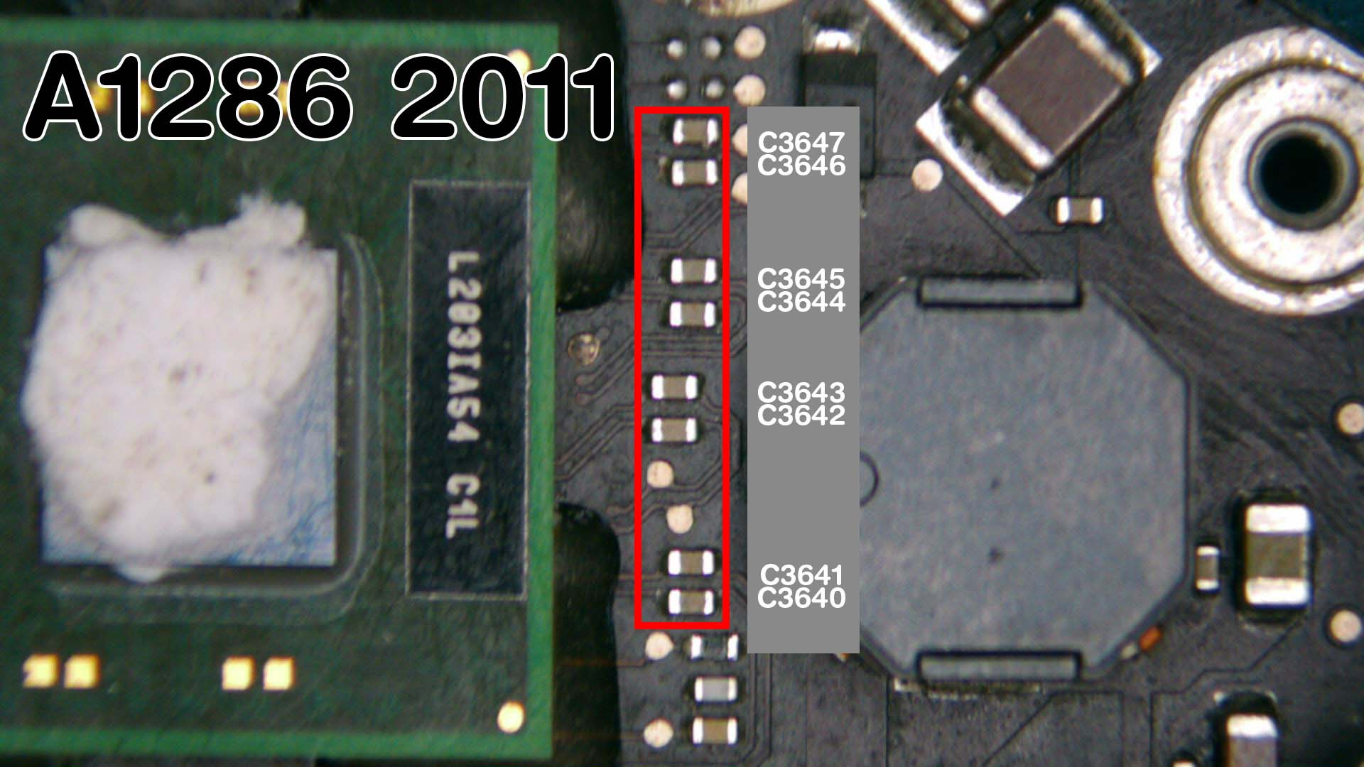 For A1286 2012, this is the list of 16x capacitors that you need to remove, and you need to take note of each capacitor’s orientation - all of them are in horizontal position.
