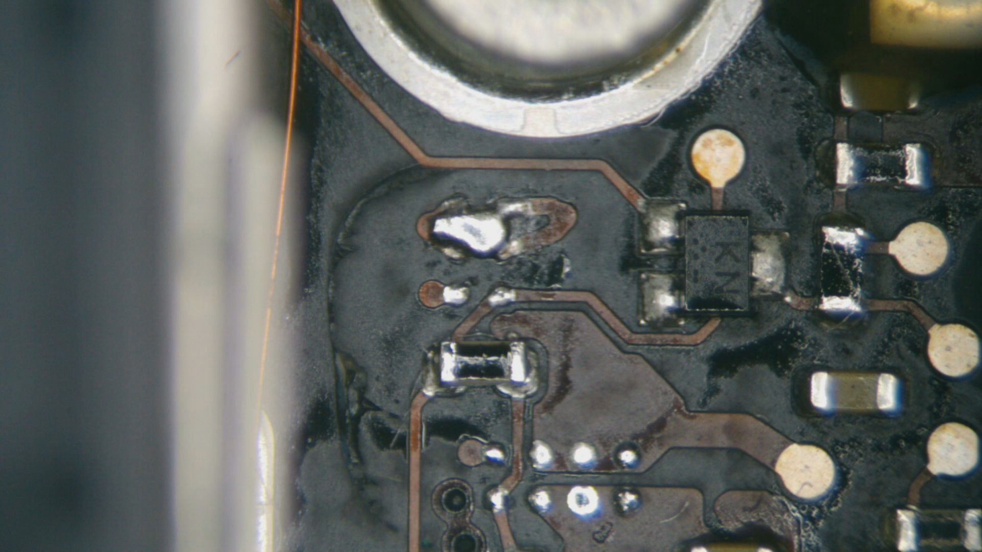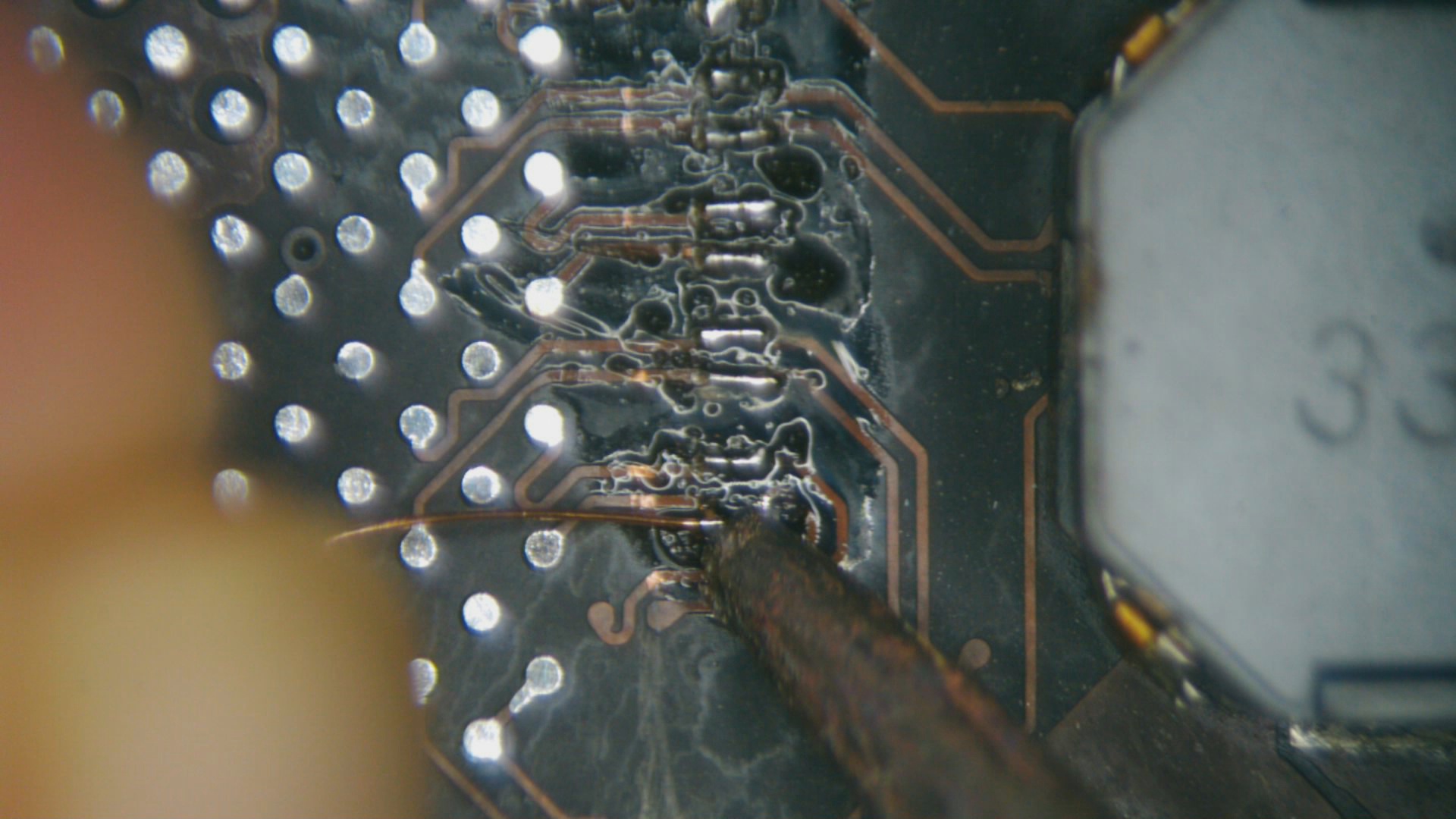 Apply flux to the pads and start to make solder bridge using 0.1mm jumper wires that should lay flat on the surface. This time we’re using a micro soldering tip to make soldering process on the 0201 solder pads much easier.