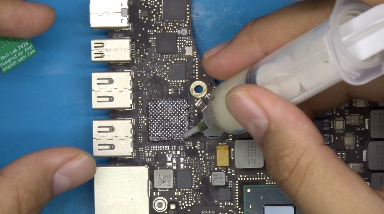 Now we are ready to solder the NevBolt-2 adapter to the board, so we will apply flux to the thunderbolt footprint and spread it out to all of the solder pads.